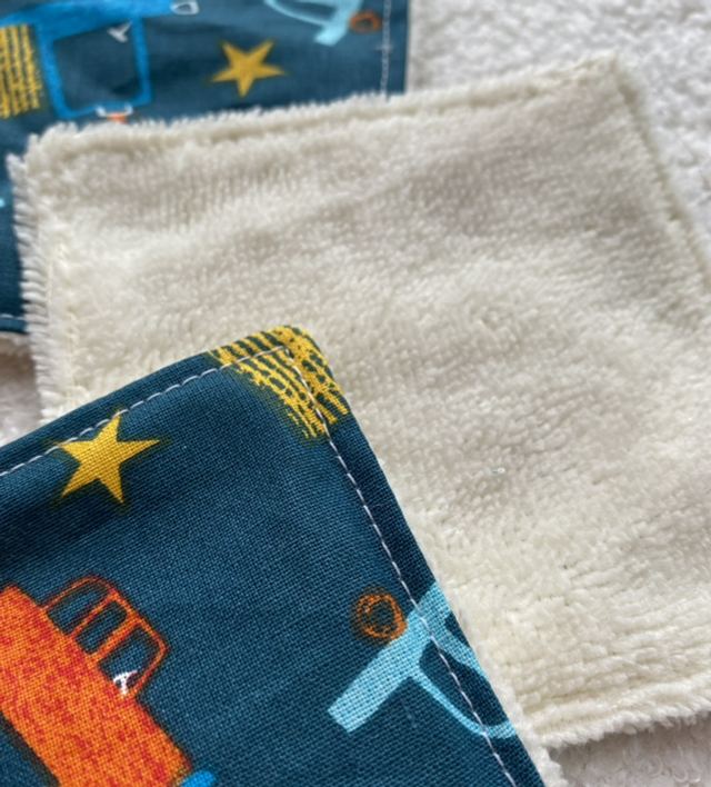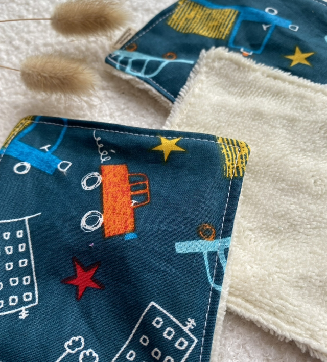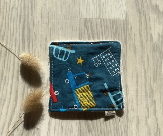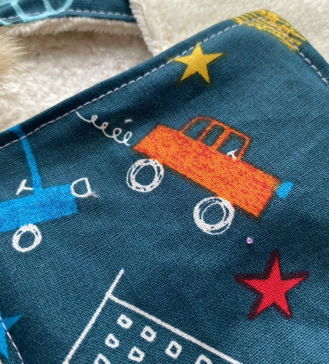 Ajoutez une touche de fun et de douceur à votre quotidien avec ce coton lavable cousu main, orné d’un tissu bleu canard à petites voitures colorées !