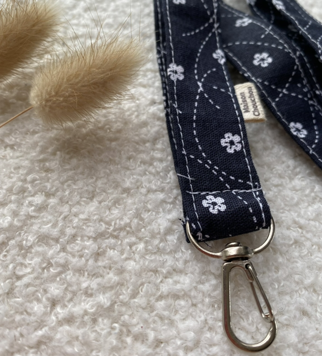 Portez votre badge ou vos clés avec élégance grâce à notre porte-badge en tissu Astrée, un bleu profond parsemé de petites fleurs blanches pour une allure douce et raffinée.